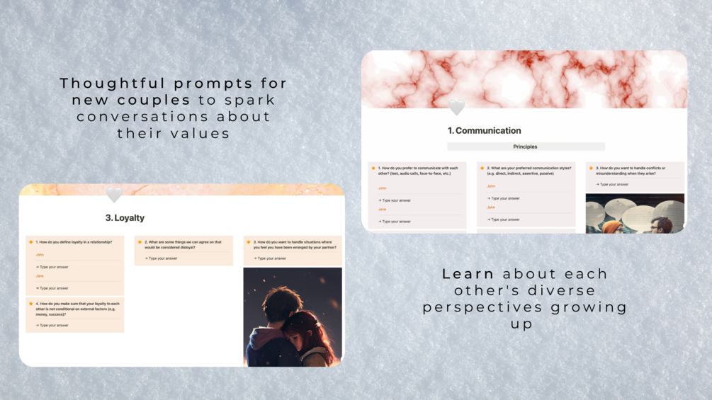 Assessing compatibility is crucial for new couples who want to build a strong, lasting relationship. By discovering and discussing your relationship values early on, you'll create a solid foundation for your partnership and make informed decisions about your future together. This Notion template facilitates these essential conversations, helping you build a deeper connection with your partner.