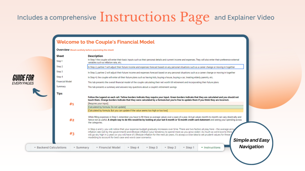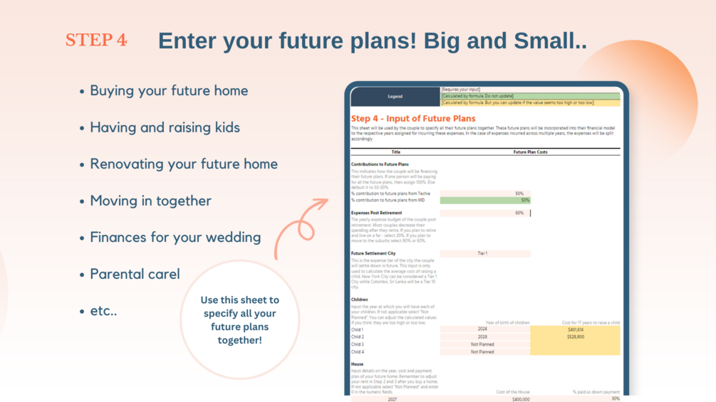 This sheet helps you create your very own personal financial model with your partner. It will guide you through a very simple, step-by-step process to forecast your future net worth based on you and your partner's current income, expenses, investments and future earning potential. The sheet offers limitless flexibility and is able to account for situations such as changing salaries, moving in together, etc while forecasting your future income and expenses. It then allows you to insert all future plans to their respective year of occurrence and creates a financial model for you that shows you your net worth at your age of retirement. It also tells you how long your savings will last based on your expenses at the year of retirement. YES! A lot of important decisions can be made using this sheet and we strongly believe it will change your financial outlook on life.