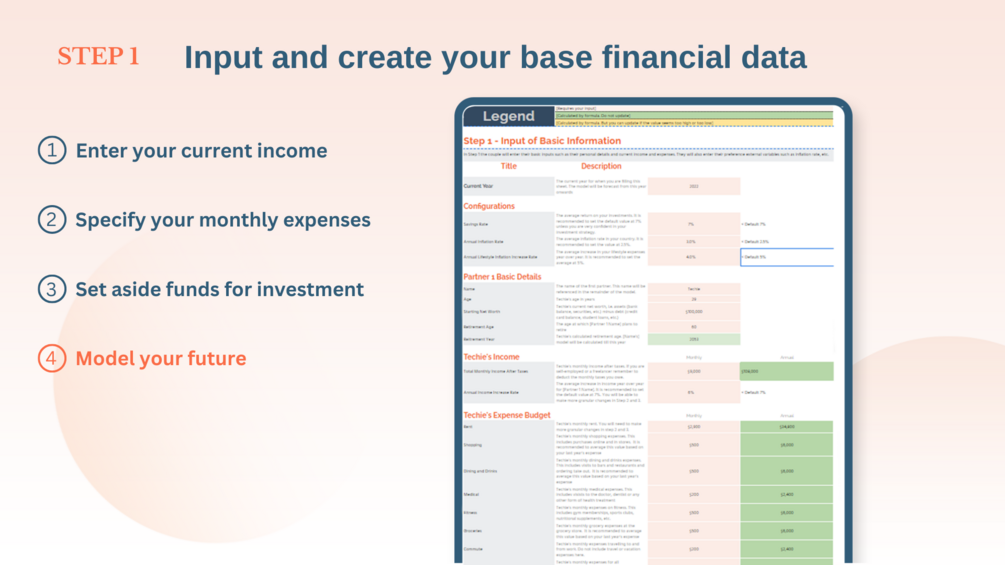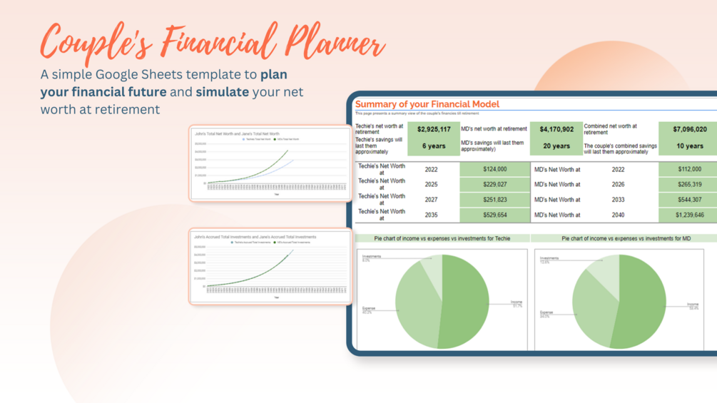 A simple and organized Google Sheets template that lets any couple input their current earning and spending budgets and forecast their future earning potential and net worth. This sheet will take you through a step-by-step process of planning important future decisions such as having kids or buying a house or taking a break to travel the world!