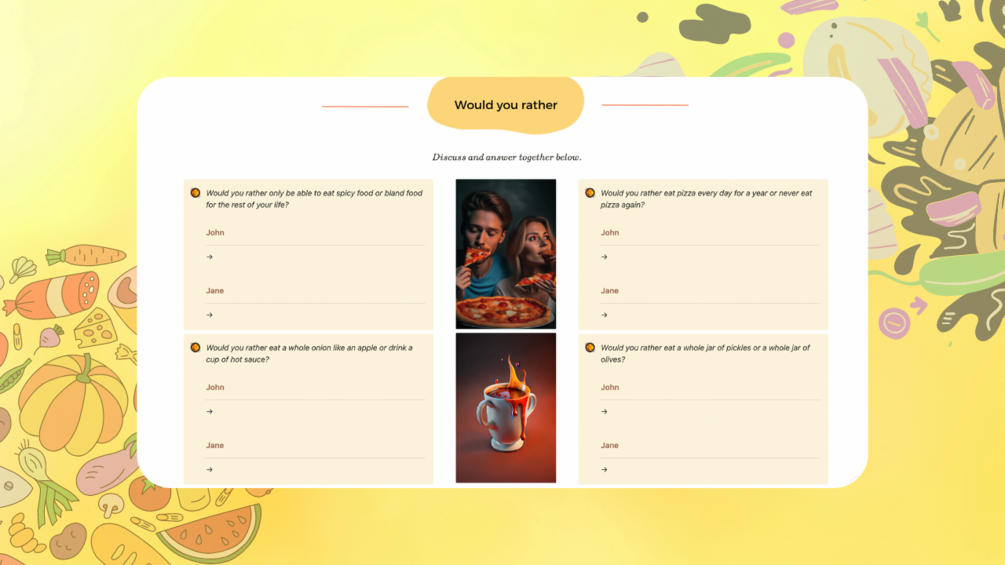 - Would You Rather: Ignite lively discussions with light-hearted, food-centric 'Would You Rather' prompts that promise giggles, debates, and fascinating revelations.