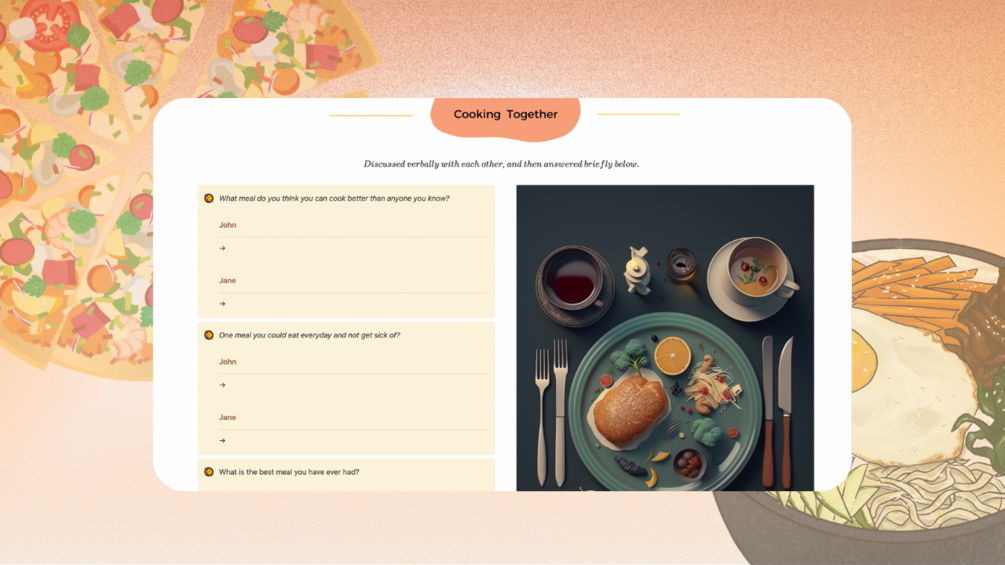 - Cooking Together: Share cherished dishes you both love to whip up, recall those triumphant culinary hits (and the amusing misses), and list down those enticing recipes you're both eager to try next.